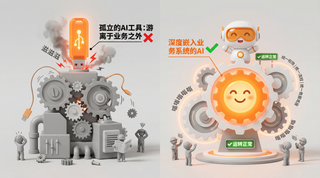 企業(yè)的復(fù)雜性,體現(xiàn)在交叉的業(yè)務(wù)流程、分層的組織架構(gòu)、嚴(yán)格的權(quán)限體系和分散的業(yè)務(wù)系統(tǒng)。這也決定了**AI若僅作為“外掛工具”,永遠(yuǎn)只能做些寫(xiě)報(bào)告、出方案的邊緣工作,無(wú)法觸達(dá)企業(yè)經(jīng)營(yíng)的核心**。